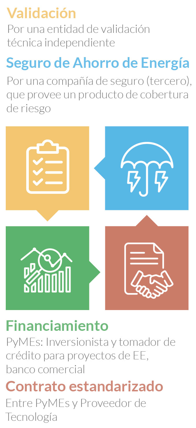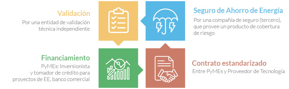 4. Financiamiento. El apoyo financiero requerido por los clientes o inversionistas se canaliza a través de instituciones financieras interesadas en crear un mercado y una cartera de proyectos con ahorros energéticos asegurados. El cliente es responsable de solicitar al banco un préstamo para financiar su proyecto.