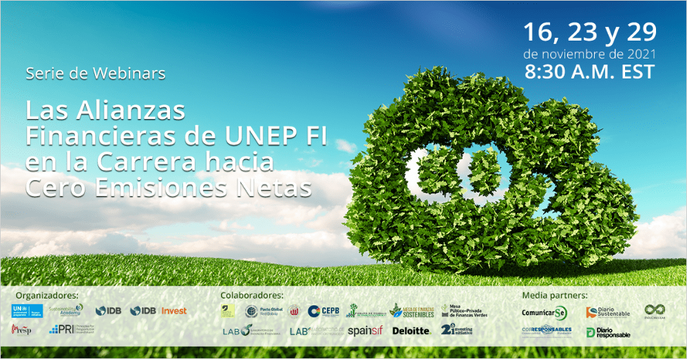 En este contexto, UNEP FI, la Academia de sostenibilidad del eco.business Fund, Banco Interamericano de Desarrollo (BID), Los Principios de Inversión Responsable (PRI), el Centro de Finanzas Sostenibles y Responsables de España (FINRESP), con la colaboración de la Mesa Público-Privada de Finanzas Verdes de Chile, la Mesa de Finanzas Sostenibles (MFS) de Paraguay, la Iniciativa de Finanzas Sostenibles de Ecuador, la Mesa de Finanzas Sostenibles (MFS) de Bolivia, el Grupo de Trabajo de Finanzas Sostenibles de Panamá, la Mesa de Chile, el Laboratório de Inovação Financeira (Brasil), el Laboratorio de Innovación Financiera (México), Spainsif, Deloitte y 2dii, y con ComunicarSe, Diario Sustentable, País Circular, Diario Responsable y Corresponsables como Media Partners, organizan en noviembre una Serie de Webinars sobre “Las Alianzas Financieras de UNEP FI en la Carrera hacia Cero Emisiones Netas”.