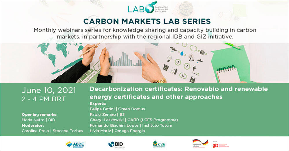 El webinar «Certificados de descarbonización: Renovabio y certificados de energía renovable y otros enfoques», es el cuarto webinar de una serie de seis webinars sobre mercados de carbono, organizados por el Grupo de Trabajo de Finanzas Verdes del Laboratorio de Innovación Financiera (LAB) de Brasil, con la colaboración del BID y la GIZ como parte de un esfuerzo regional para el intercambio de conocimientos y la creación de capacidades en los mercados de carbono.