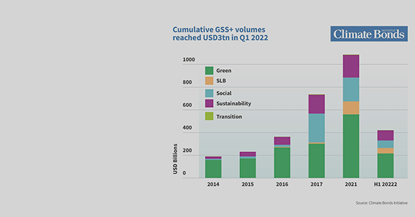 La Iniciativa de Bonos Climáticos (CBI) publicó su informe del primer semestre (1S) de 2022 sobre el mercado de deuda verde, social, sostenible, vinculado a la sostenibilidad y de transición (GSS+ por sus siglas en inglés), el cual alcanzó un volumen combinado de 417,8 mil millones de dólares. Estas cifras muestran una disminución interanual del 27%, sin embargo el segundo trimestre (2T) aumentó un 25% con respecto a los volúmenes del 1T.