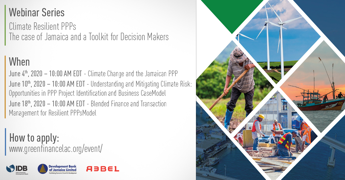 The IDB, in collaboration with the Development Bank of Jamaica, and IMG Rebel, is pleased to invite you to a series of webinars where we will discuss the potential for Climate Resilient Public-Private Partnerships for development projects. We will also present the Resilient PPP Toolkit: an instrument to support decision-makers in the process of structuring and managing PPP projects that would be resilient to climate change and natural disasters.
