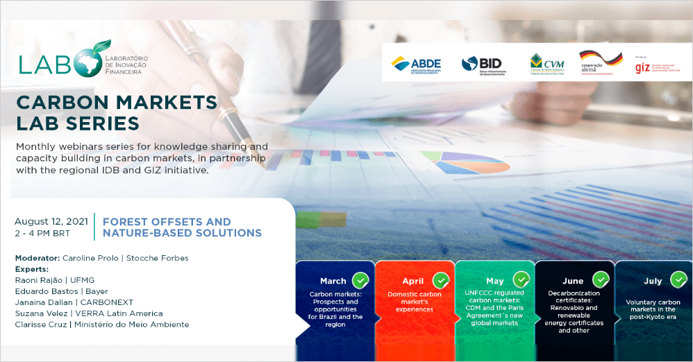 The webinar “Forest offsets and nature-based solutions”, is the sixth webinar of a series of six webinars on carbon markets, organized by the Green Finance Working Group of the Financial Innovation Lab (LAB) of Brazil, with the collaboration of the IDB and GIZ as part of a regional effort to knowledge sharing and capacity building on carbon markets.