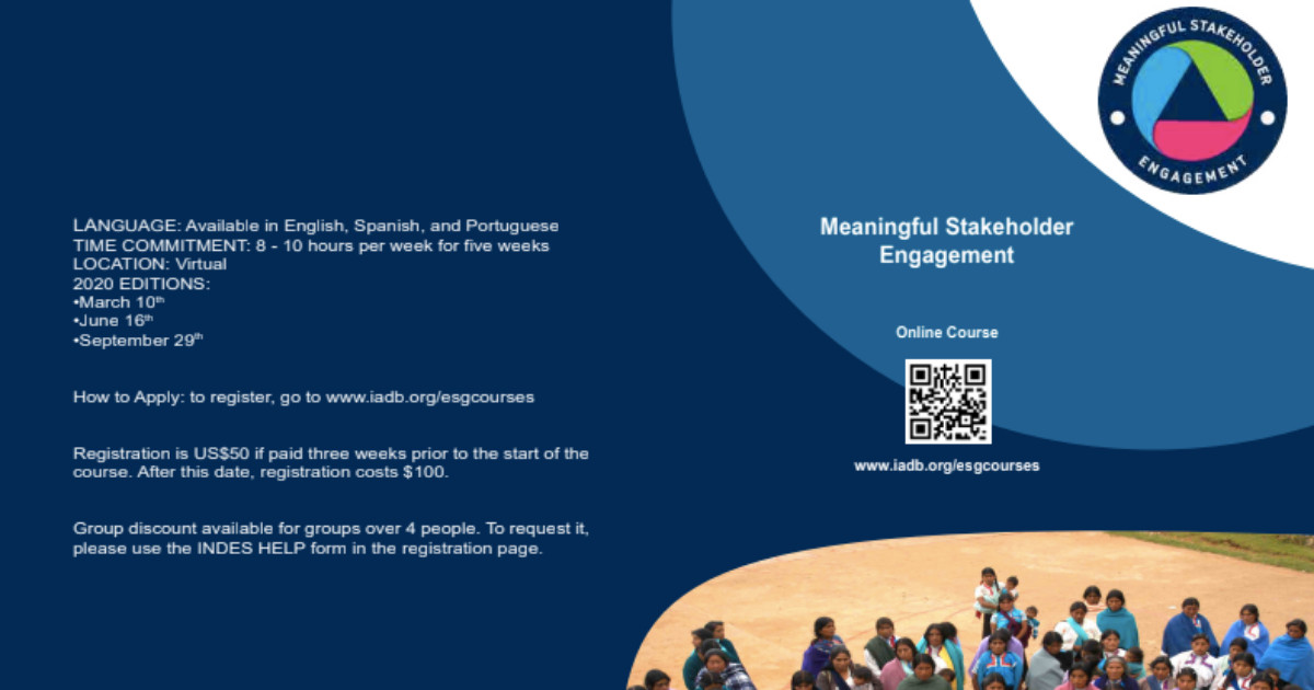 This course offers an overview of the principles and content that should be present for a consultation process to be considered “meaningful”. Since it is not feasible to discuss every possible circumstance in detail, the course reflects on principles and gives overall guidance, rather than a standard blueprint or “one size fits all” approach. Broadly, the course addresses three aspects of how consultation is approached in IDB policies and how good practice has evolved: